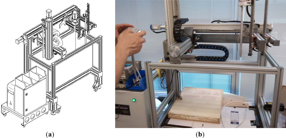 The input signal is generated with an Agilent Technologies (Santa Clara, CA, USA) 33220A signal generator. The received signal was ×10 preamplified by a LM324 AC coupled inverting operational amplifier to obtain more than 200 mV Pk–Pk in the receiver and eventually acquired using a digital PC oscilloscope, Pico Technology (Cambridgeshire, UK) model PicoScope 3224. The data acquisition stage is coordinated with an automated positioning system, described below. In order to increase the signal-to-noise ratio, 50 signals have been averaged. Around five periods of long time domain signals have been post-processed to extract both the amplitude and the phase. Thus, disregarding the time needed to move the sensors along the surface, a single point measurement takes less than 50 ms, including averaging.