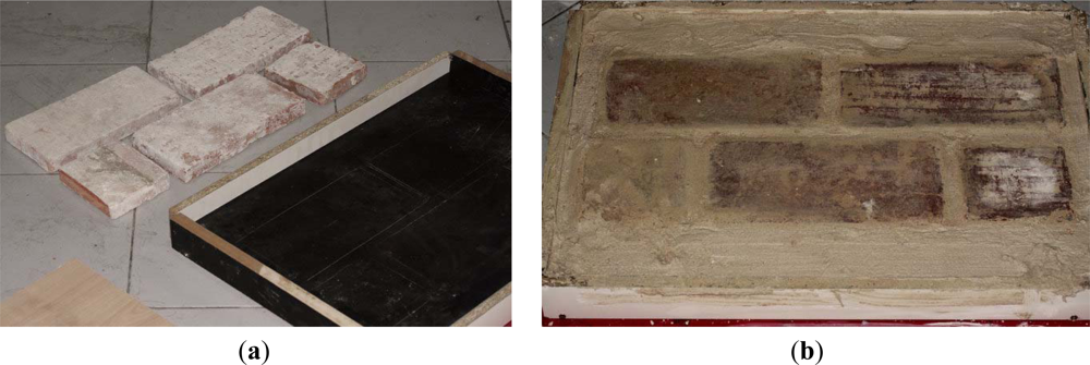 The test specimen (Figure 4) was built manually with brick clay and mortar of lime and sand. The joints are 2 cm wide and the coating of 7 mm in depth. The test specimen was prepared with materials and techniques similar to those of the Gothic building with the aim that the results could be extrapolated.