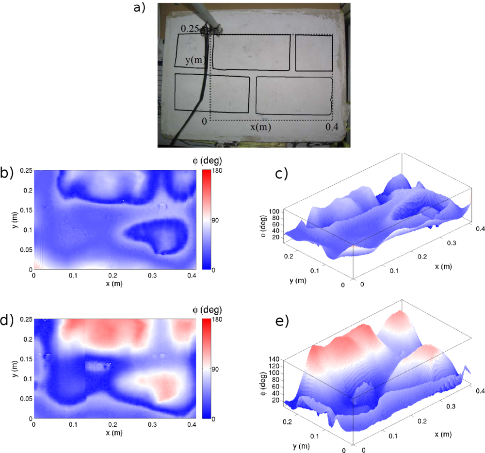 As shown in Figure 6, the offset phase remains constant within the areas composed of the same material. However, at material interfaces (brick-board) phase shows abrupt changes. These abrupt changes allow us to clearly appreciate the limits of the bricks. In general, for the two heights of studied the same results are obtained, indicating the robustness of the phenomenon.