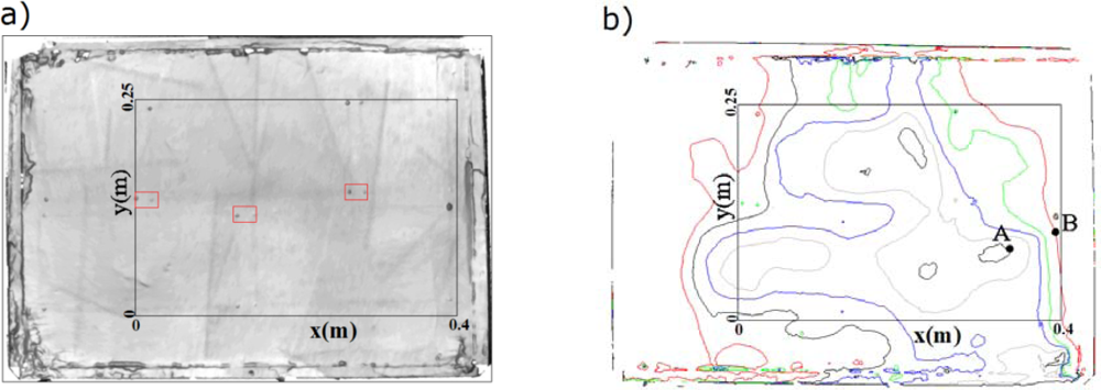 The maximum change in height variations occurs for distances greater than 6 cm. Figure 7(b) shows that the maximum height gradient exists between points A and B. In the results shown in Figure 6, there are angular delays greater than 73.33° between points located very close to each other. On the other hand, observing the contour lines in Figure 7(b), there is no correspondence with the geometry and brick arrangement of the test specimen.