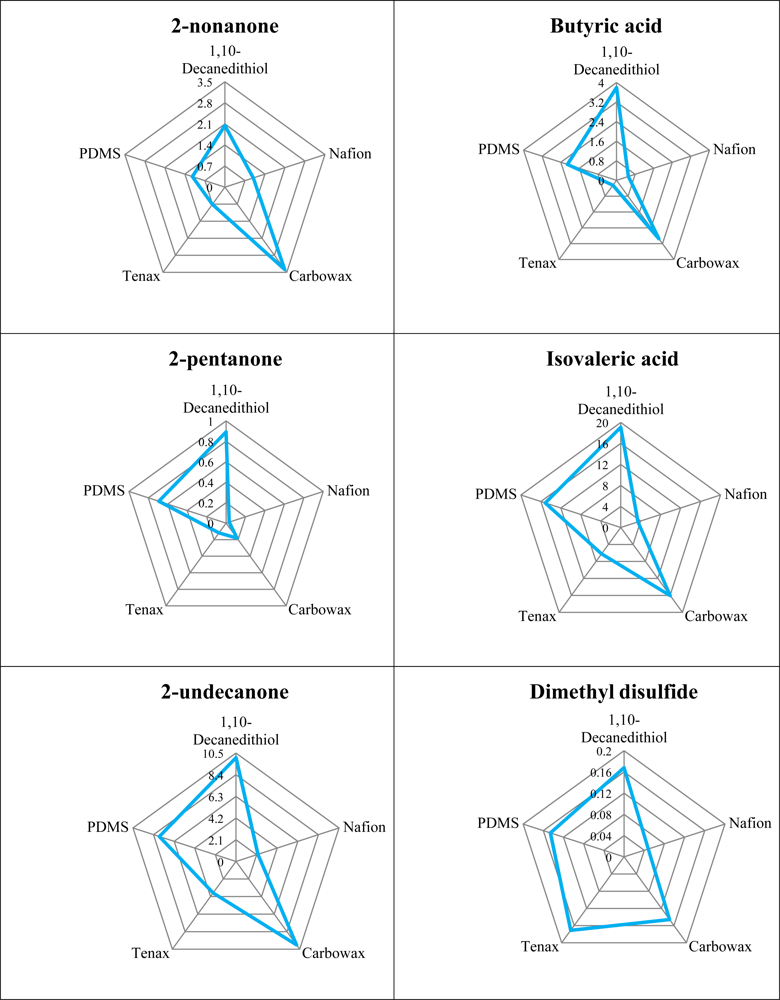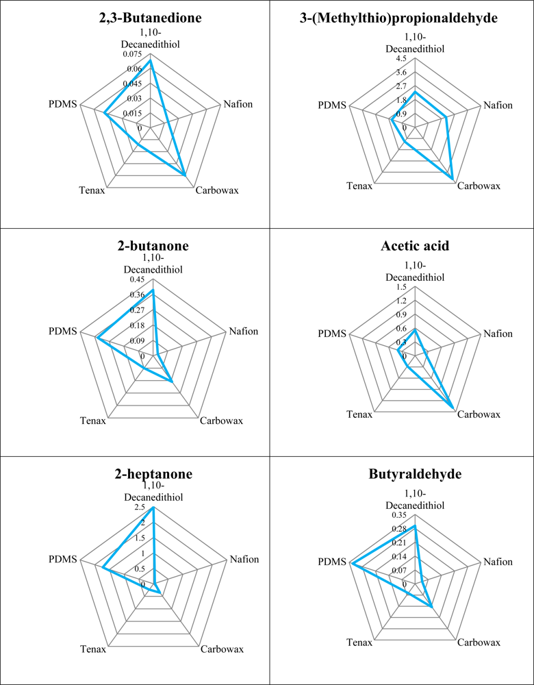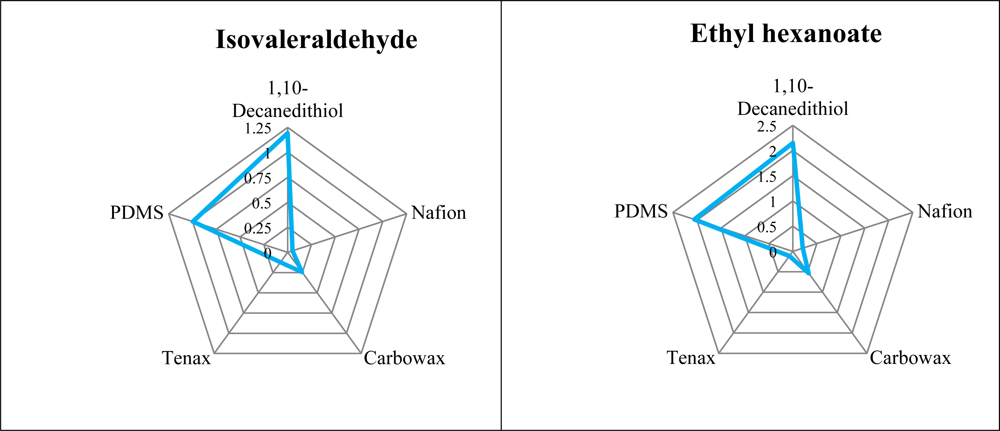 Sensitivities were not only defined by the coatings applied to the sensors, but also by the ability of the fibre to extract the compounds from the headspace. The SPME fibre used was coated with Carboxen-PDMS and has been shown to be capable of extracting alkanes, esters, methyl ketones, carboxylic acids, as well as sulphur compounds [19].