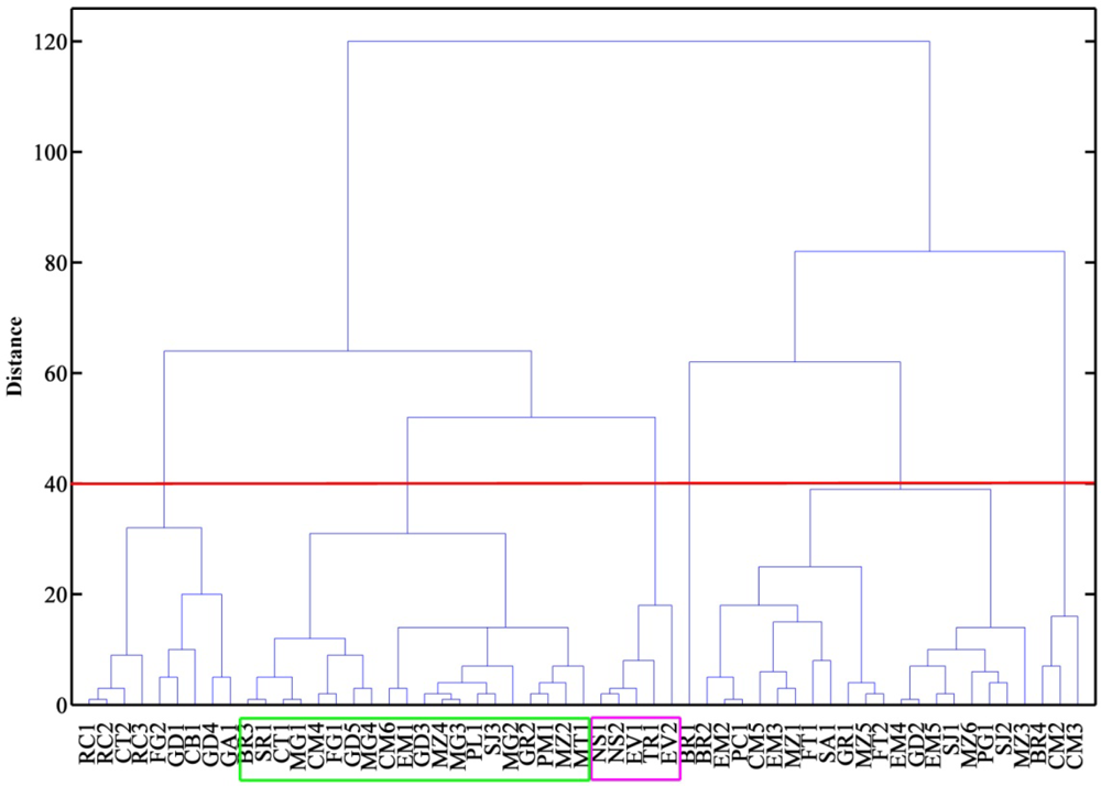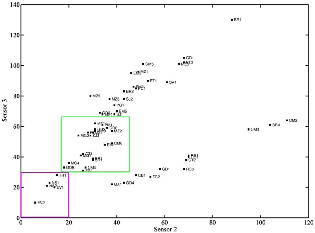 Figure 4 shows the dendrogram obtained based on data from sensor 2 and sensor 3, with Chebyshev distances and complete linkage. It can be seen that a first group contained five of the ten ewe cheeses, and that the other five ewe cheeses (four Manchego cheeses and one Seia cheese) belonged to another group, where one cheese made of a mixture of ewes’, goats’ and cows’ milk, goat cheese, buffalo cheese and some cows’ milk cheeses could also be found. Most of the cows’ milk cheeses (32) were excluded from these groups. Figure 5 shows a plot of the frequency decreases observed for sensor 3 vs. sensor 2, where the groups containing ewes’ cheese have been marked. It can be concluded that ewe cheeses are characterized by low frequency shift responses on both sensors. Analytical signals of less than 30 on sensor 3 and 20 on sensor 2 could be undoubtedly assigned as belonging to ewes’ cheese. Cheeses giving rise to signals between 30 and 60 on sensor 3 and between 18 and 45 on sensor 2 could also be from ewes’ cheese, but classification was not solid. Outside these limits, no cheese made from ewes’ milk could be found.