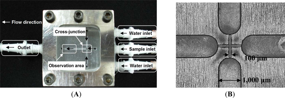 We used a 4-axis machine tool (Ta Liang Technology Co., Ltd., Taiwan) to manufacture the microchannels on a surface-polished 6061 aluminum alloy substrate. A high-speed (up to 40,000 rpm) spindle was installed on the 4-axis machine tool to provide micro-milling cutters with a small run-out at high turning speeds for creating the microchannels by high-speed micro-milling. The cutting-depth was set to 5 μm per cut for the micro-cutting process. We programmed 10 passes on the CNC micro-milling machine to reach a 50 μm depth. After the surfaces of the microchannels were finished, four 1 mm inner channels were drilled in the broadening channels (1,000 μm in width) to slow down the flow and enhance observation at the downstream of the cross-junction. Figure 2(A,B) show photographs of the proposed Al-based microfluidic device with a 100 μm wide cross-junction. Figure 2(C,D) show the expanded and the perspective drawings of the device, respectively. The microfluidic chip consists of three layers, the cover layer (epoxy resin containing six screw orifices for binding), the middle layer (glass window, 10 mm thick) and the bottom layer (aluminum disk structure containing one outlet, three inlets, and six screw orifices). These three layers were then integrated using six M4 screws (0.5 mm pitch, 4.0 mm diameter, and tightened by a force of 1.0–1.2 Nm). Fluid interconnections between the chip and the tubes were made by straight connectors. Because the glass window and aluminum disk had been surfaced to get a perfect plane surface, this microfluidic chip could be leak proof. The microfluidic platform was easy to fabricate, easy to set up, as well as easy to organize and program.