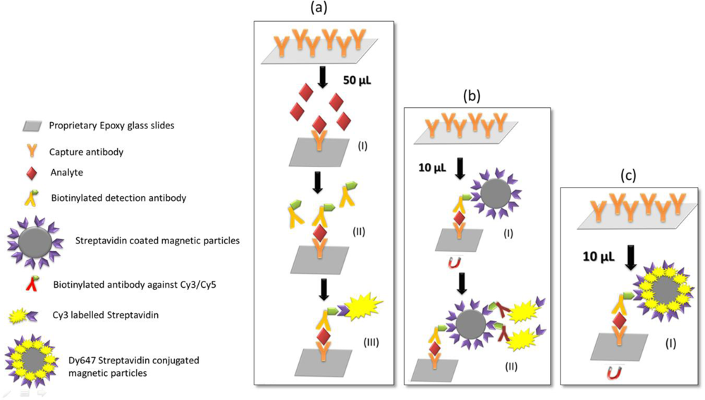 Chip platform used was the proprietary ARChip Epoxy [14], Anti IL-6 (MQ2-13A5), recombinant IL-6 protein, biotinylated anti IL-6 (MQ2-39C3) as well as anti IL-10 (JES3-9D7), recombinant IL-10, biotinylated anti IL-10 (JES3-12G8), anti TNF alpha (MAb1), recombinant TNF alpha and biotinylated TNF alpha (MAbF6C5) were purchased from eBioscience (San Diego, CA, USA). Anti S-100 (MAb8B10), S-100 protein, biotinylated anti S-100 (MAb6G1), anti PCT (MAb16B5), biotinylated anti PCT (MAb42) and CRP-free serum were obtained from Hytest (Turku, Finland). Anti E-Selectin, human E-Selectin, biotinylated anti E-Selectin were purchased from R&D Systems (Minneapolis, MN, USA). Anti CRP (C5) and biotinylated anti CRP (C7) were from Exbio (Vestec, Czech Republic). Human procalcitonin was obtained from ProSpec-Tany TechnoGene Ltd. (Rehovot, Isreal). Neopterin conjugated with bovine serum albumin (BSA) and antibodies mAb 3E2 were kindly provided by Milan Franek, Veterinary Research Institute, Brno, Czech Republic and labelled with Dy647 by Exbio. Dy647 Streptavidin was from Dyomics (Jena, Germany) and Cy3-Streptavidin was from GE Healthcare (Chalfont St Giles, UK). Streptavidin coated magnetic particles with a 1 μm diameter were purchased from Roche (Basel, Switzerland), Streptavidin coated magnetic particles with a 500 nm and a 130 nm diameter were from Spherotech Inc. (Lake Forest, IL, USA) and magnetic particles with a 500 nm diameter were from micromod (Rostock-Warnemuende, Germany). Biotinylated anti Cy3/Cy5 (Cy-96), Tween 20, CHAPS, glycidyloxypropyltrimethoxysilane (GOPS), polyethylenglycol, MW 6000 (PEG 6000), ethanolamine and sodium deoxycholate were purchased from Sigma (St. Louis, MO, USA). 1-Ethyl-3-(3-dimethylaminopropyl)carbodiimide (EDC) was from Fluka Biochemicals (St. Louis, MO, USA). Phosphate buffered saline (PBS, pH 7.2) was purchased from Gibco (Invitrogen, Grand Island, NY, USA) and MES buffered saline packs were from Thermo Fisher Scientific (Portsmouth, NH, USA).