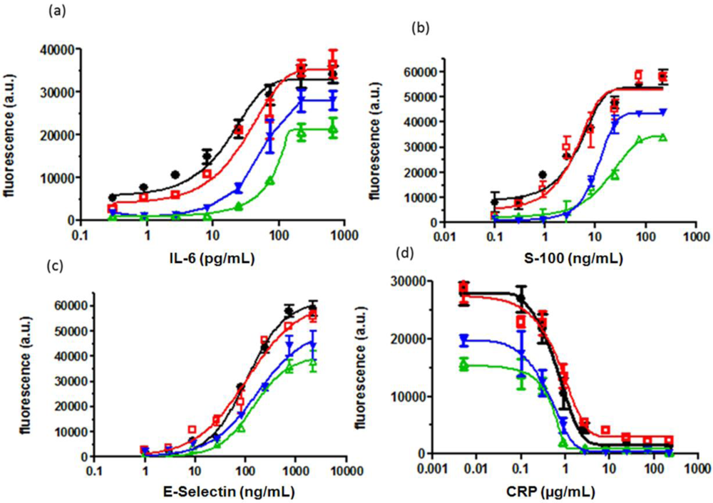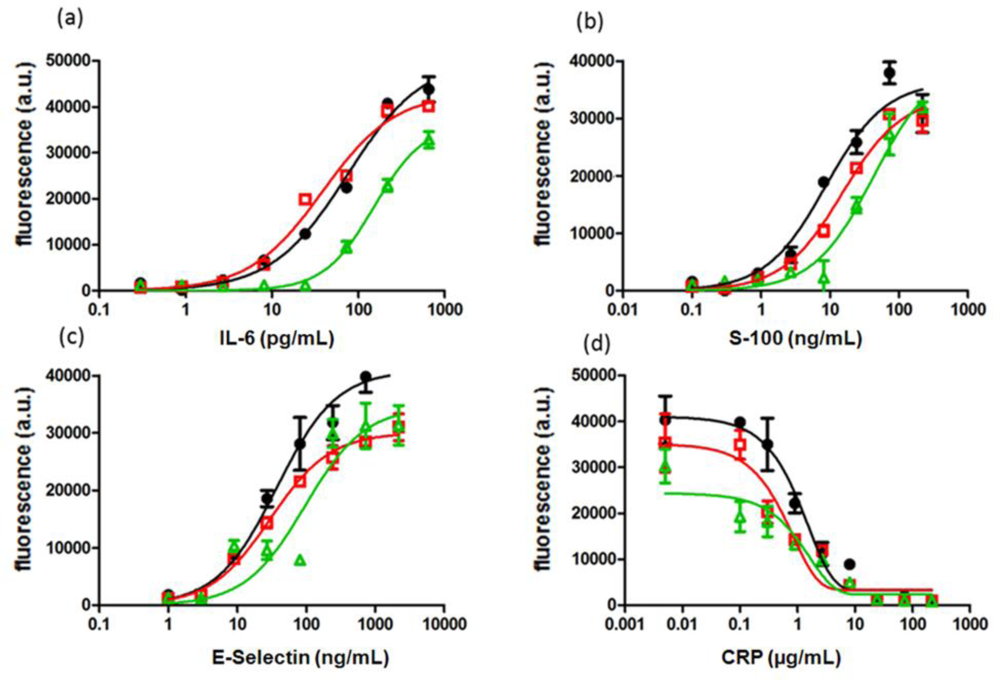 Figure 3 indicates that the effect of incubation time on the calibration curves is similar for all analyzed biomarkers. A decrease of incubation time provokes a loss in sensitivity which can be seen from the shift of calibration curve to higher analyte concentrations, reduced fluorescence signals and increased IC50 values. IC50 values are listed in Table 2 together with LODs and CVs. While sensitivity expressed by LOD, LOQ and IC50 is similar for IL-6 and E- Selectin after 2 h and 2.5 h incubation, there are significant differences observed for S-100 and CRP. Sensitivity was drastically reduced for all tested biomarkers, if incubated for only 1.5 h. Interestingly, reproducibility of data was not affected and remained the same (CV < 14%) regardless what incubation time or analyte was used.