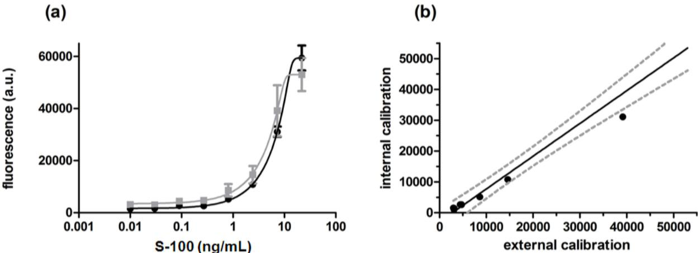 The calibration curves are almost identical both in terms of shape and maximal signal intensities which is in accordance with the assay parameters obtained (internal calibration: LOD 0.239 ng/mL, LOQ 1.152 ng/mL, IC50 3.38 ng/mL, CVinter 12%; external calibration: LOD 0.241 ng/mL, LOQ 0.976 ng/mL, IC50 2.84 ng/mL, CVinter 13%). Figure 4(b) depicts the correlation and precision between internal and external calibration. The fluorescence signals obtained for the external calibration are plotted against the fluorescence signals from the internal calibration. A strong linear correlation (coefficient of determination (R2) of 0.968) was observed: most values cluster within the 95% confidence band (grey dotted lines) of the fit line. The significance of the linear correlation is confirmed by a p-value below 0.01%. The mean intra-array variation was 10.4% for the external and 10.8% for the internal calibration.