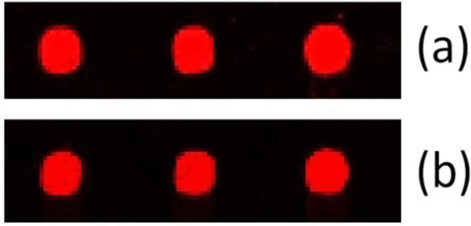 Figure 4(a) compares the curves obtained for the internal and external calibration, and Figure 5 shows a typical fluorescence image of processed calibration spots. The image demonstrates the high quality of the arrayed spots which is depicted by the regular spot morphology, the concise shape and the even distribution within the spot. This is also reflected in the good reproducibility of biomarker measurement as can be seen from Table 3: the coefficient of variation is ≤14%.