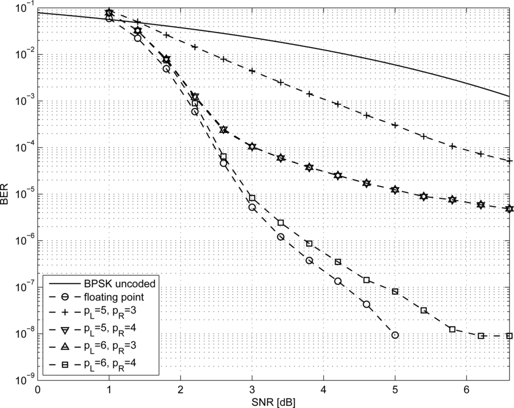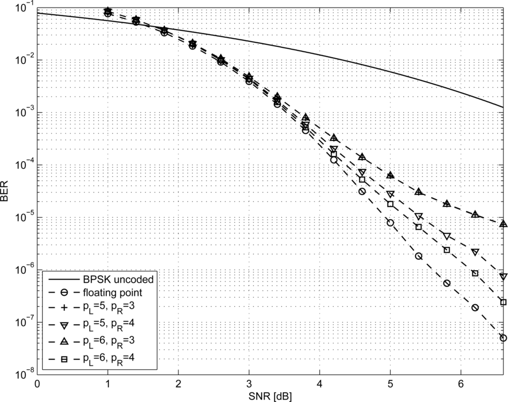 In order to size the LDPC decoder architecture, finite precision analysis ought to be performed. Given that pS and pR are the number of bits to represent Sj and Rmj metrics respectively, as in Equations (1–6), simulations have been carried out for pS ∈ {5, 6} and pR ∈ {3, 4}; normalized-min-sum approximation with σ = 0.875 has been employed. The performance of the three considered codes are shown in Figures 1–3 both in the floating point and fixed point cases together with the performance of the corresponding uncoded system. Furthermore, it has been observed that targeting a BER of 10−4 as in [3,9] and imposing a maximum of ten iterations (I = 10), the performance loss is negligible.