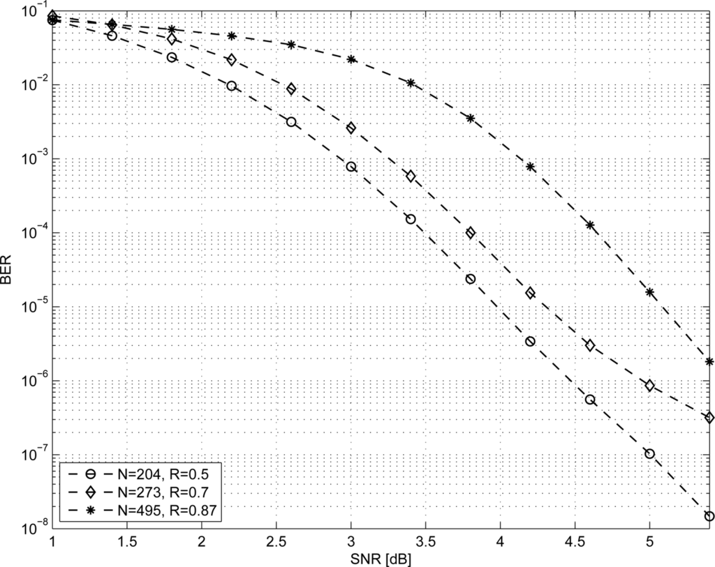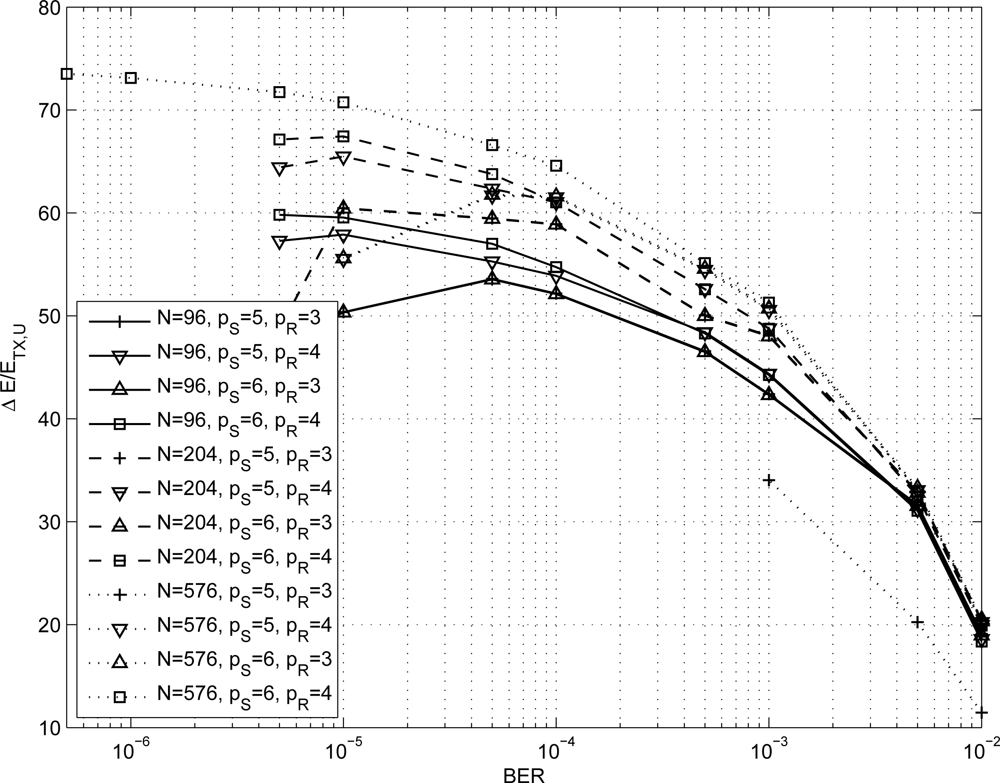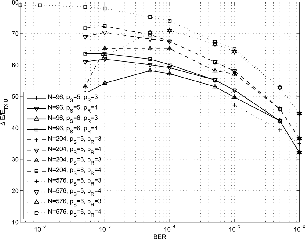 As it can be observed, both for n = 3 and n = 4 at a BER of 10−4 the percentage of saved energy is more than the 50% and, in the best case, it achieves the 80%. It is worth pointing out that when a code reaches the error floor region, the percentage of saved energy is maximum and then it decreases. Thus, the best energy saving performance is achieved in the waterfall region of the code.