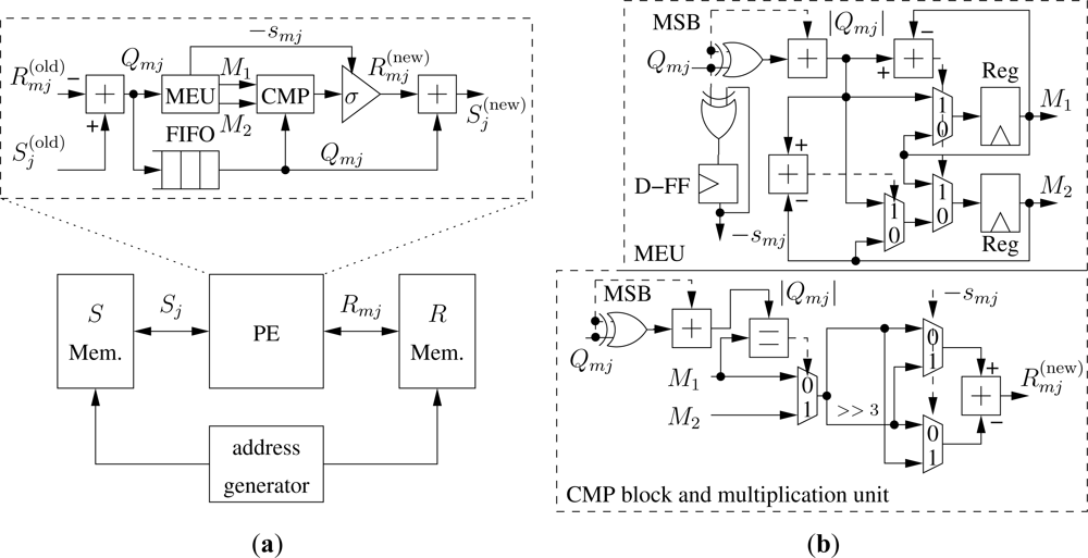 As it can be observed, the throughput increases with R so low-rate codes are a conservative choice to achieve the target throughput. Moreover, if we fix N we observe that increasing the rate has the effect of reducing the BER performance of the code. Thus, we considered the N = 204, R = 0.5 code and tried to increase both N and R. From MacKay database [31] we considered the following two high-rate codes where N > 204: N = 273, R = 0.7 and N = 495, R = 0.87 referred to as 273.82.3.353 and 495.62.3.2915 respectively. As shown in Figure 4 the BER performance of both codes is lower than the one obtained for N = 204, R = 0.5. Furthermore, codes with N > 204 require a larger amount of memory than the N = 204, R = 0.5 code. From this analysis we infer that for the most complex code among the ones considered in this work, i.e., for the IEEE 802.16e N = 576, R = 0.5 code, and given the target throughput T = 250 kb/s and I = 10, Equation (14) leads to fclk ≥ 17.5 MHz. In this work we fix fclk = 20 MHz as a conservative value. Thus, the proposed architecture, inspired by the data-path of the solution proposed in [32], is made of four blocks as shown in the bottom part of Figure 5(a): a processing element (PE) devoted to implement the computation described in Equations (1–6) with the normalized-min-sum approximation; S and R memories, where Sj and Rmj metrics are stored; and an address generator. As depicted in the upper part of Figure 5(a) the PE contains: (i) a subtractor to compute Qmj Equation (1), (ii) a Minimum-Extractor-Unit (MEU), a compare block (CMP) and a multiplication by ±σ required to compute smj Equation (3) and with the normalized-min-sum approximation Equation (6), (iii) a synchronization FIFO with locations, (iv) an adder to compute Equation (5).