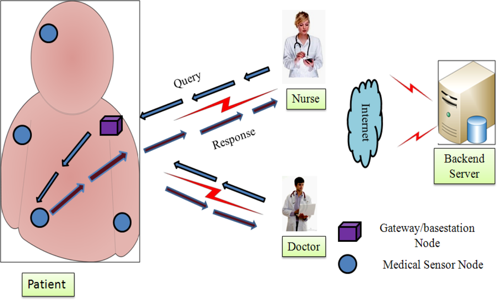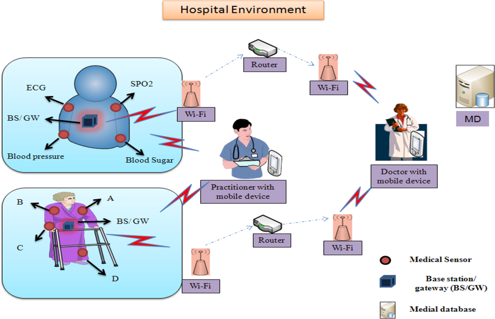 A wireless medical sensor network is a network that consists of lightweight devices with limited memory, low computation processing, low-battery power and low bandwidth []. These medical sensors (e.g., ECG electrodes, pulse oxi-meter, blood pressure, and temperature sensors) are deployed on patient’s body and collect the individual’s physiological data and sends the collected data via a wireless channel to health professionals’ hand-held devices (i.e., PDA, iPhone, laptop, etc.). A physician can use these medical sensor readings to gain a broader assessment of patient’s health status. The patient’s physiological data may include heartbeat rates, temperature, blood pressure, blood oxygen level, etc. A typical patient monitoring in hospital environment is shown in Figure 1.