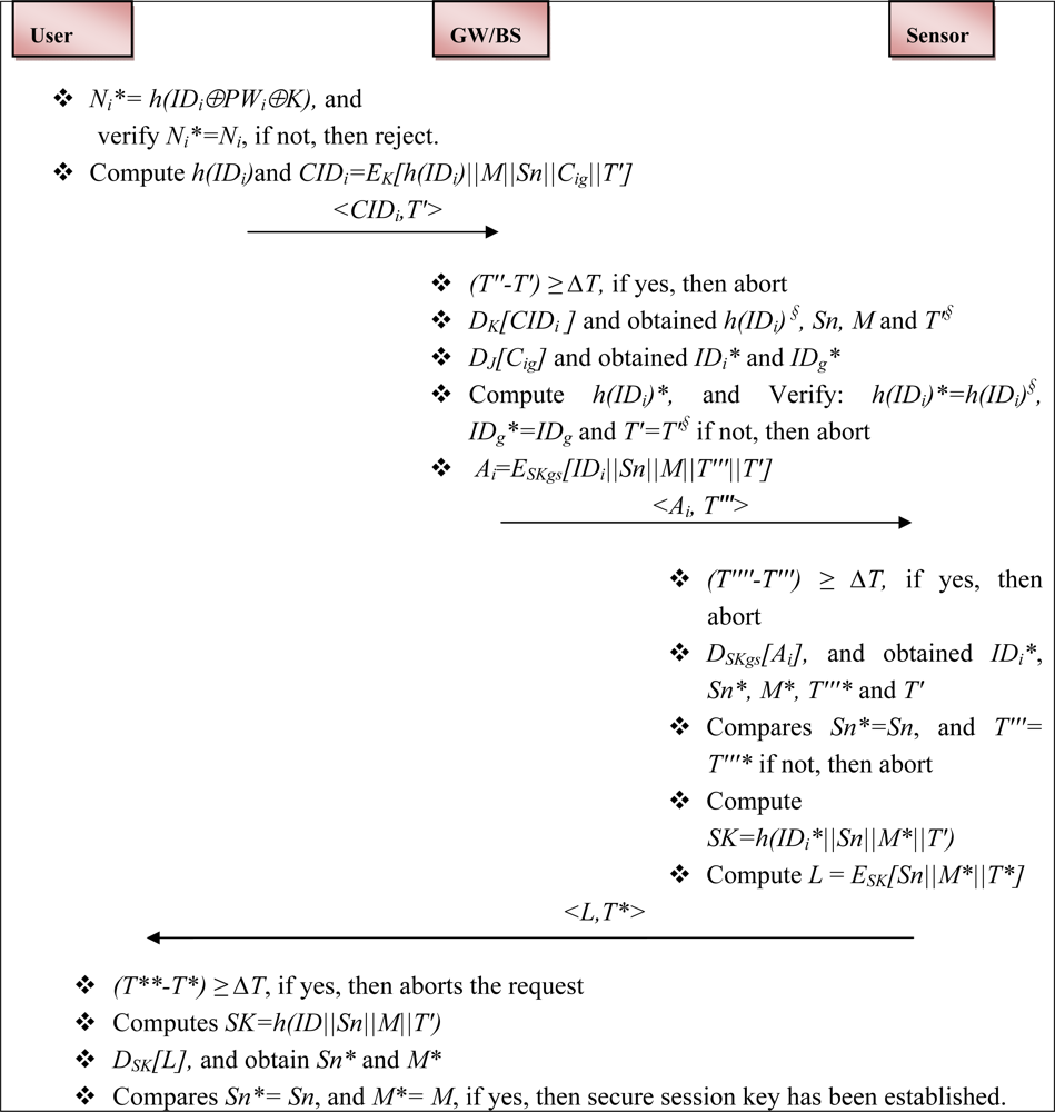 Confidentiality: Confidentiality is a paramount requirement for healthcare application using wireless medical sensor networks. In the proposed E-SAP, the session key could be used for further secure subsequent communication between both (i.e., user and medical sensor node may encrypt patient physiological information’s using the session key (SK)). Furthermore, the proposed protocol provides air message confidentiality to their messages (CIDi=EK [h(IDi)||M||Sn|| Cig||T′], Ai=ESKgs [IDi||Sn || M ||T″′||T′]and L = ESK[Sn||M*||T*]).