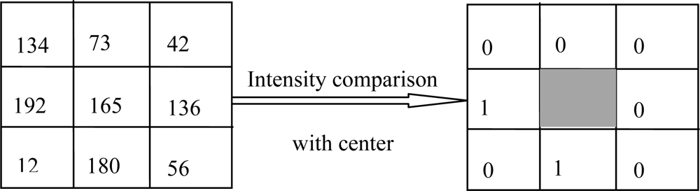 Local Binary Pattern (LBP) is a type of feature extraction method. In [30,31] an LBP operator as a nonparametric 3 × 3 kernel for texture classification was proposed. In [27] a LBP-based finger vein recognition method was proposed. An LBP can be defined as an ordered set of binary values determined by comparing the gray values of a center pixel and its neighboring pixels, as shown in Figure 1 The binary values can be expressed in decimal form as shown in Equation (1) [27]:
