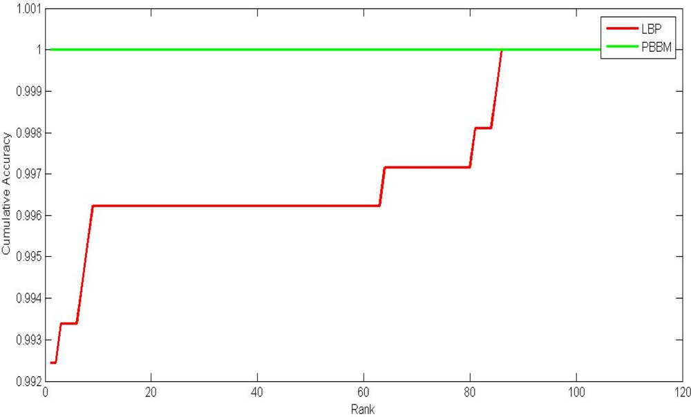 The experiments of closed-set identification (identification is performed only for individuals who are present in the enrollment database) were also conducted. In the identification mode, we do not know the class of the input finger vein, but want to identify which class it belongs to. Like the verification mode, we use the first four samples of each class in the database to generate the PBBM and use the other ten as test samples. Therefore, there are 106 templates, and 1,060 (106 × 10) probes in total. The probes were matched with all the templates models. For each probe, the matching results were ordered according to the matching scores. Then, we can get the cumulative match curves as shown in Figure 10. The cumulative matching performance, rank-one recognition rate, and lowest rank of perfect recognition (i.e., the lowest rank when the recognition rate reaches 100%) are listed in Table 5. From the experimental results, we can see that the performance of the proposed method is much better than that of the LBP-based methods. The rank-one recognition rate of the proposed method was 100%, indicating that all probes can be identified properly.