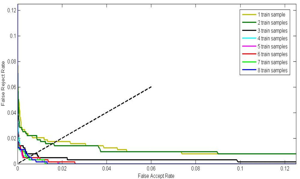 The ROC curves of PBBMs trained by different samples are shown in Figure 11, The ERR, FRR at-zero-FAR and FAR at-zero-FRR values are listed in Table 6. From Figure 11 and Table 6, we can see that better performance is achieved with an increasing number of training samples. When the number of training samples reaches 4, the performance promotion is limited. It indicates that we can only use four training samples of each class to generate a competitive PBBM.
