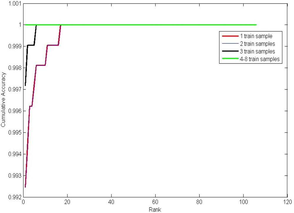 We also conduct experiments on the identification mode. Figure 12 and Table 7 illustrate the expriment results. Apprently, when the number of training samples reaches 4, the rank-one recognition rate can achieve 100%.