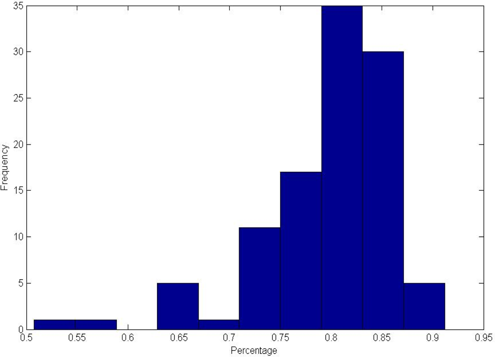 The histogram of the percentage of 106 classes for four training samples is shown in Figure 13. From Figure 13, we can see that the majority of percentages are near 0.80. In a word, the robustness of the PBBM is very high, and the recognition results are credible.