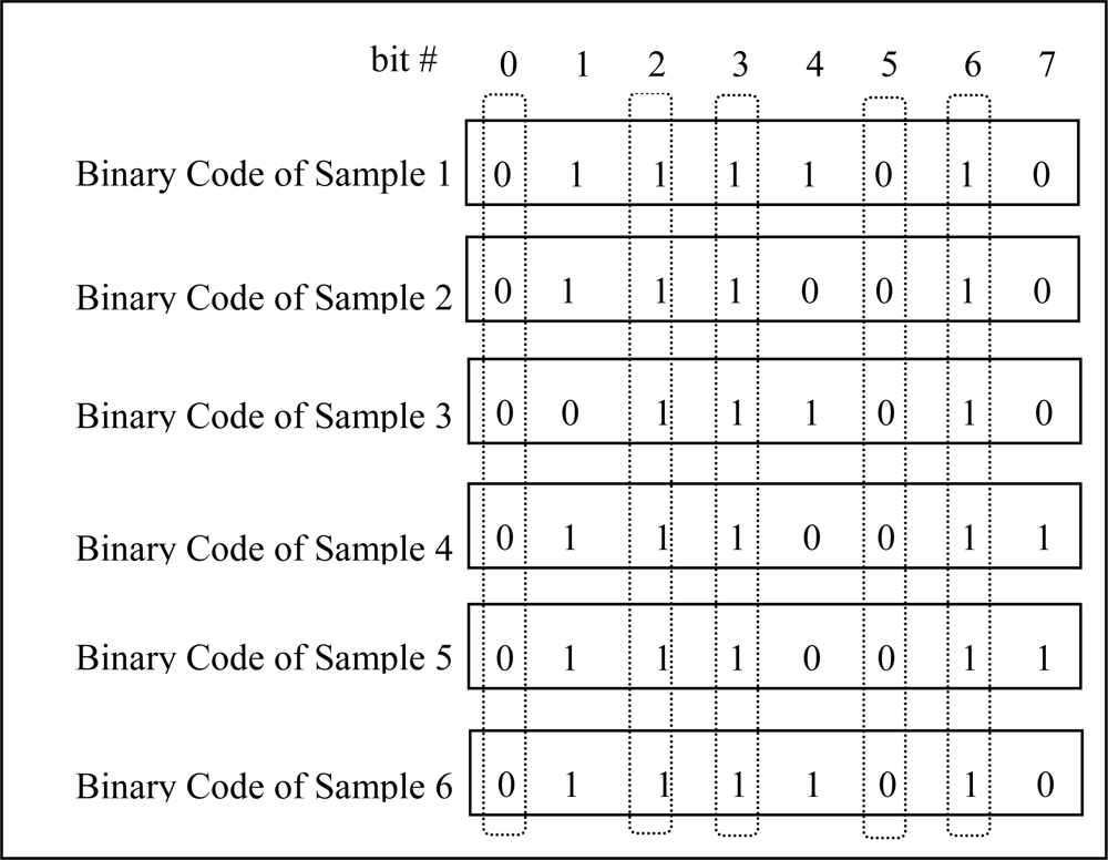 Generally speaking, many samples can be captured from an individual, and we can get corresponding LBPCodes through extracting LBP features from each sample. When investigating these LBPCodes of samples from the same finger vein, a possibly valuable phenomenon attracted our attention: the values of the bits in same location of LBPCodes have different traits. The values of some bits are consistent, either 1’s or 0’s; the values of some bits have majority of 1’s or 0’s; the values of some bits interlace 1’s and 0’s. Figure 2 gives an example of Binary Codes of six samples from a certain individual. Apparently, bit0, bit2, bit3, bit5, bit6 are very consistent, the values of bit1 are mostly 1’s, the values of bit7 are mainly 0’s, and bit4 has interlaced 1’s and 0’s values.