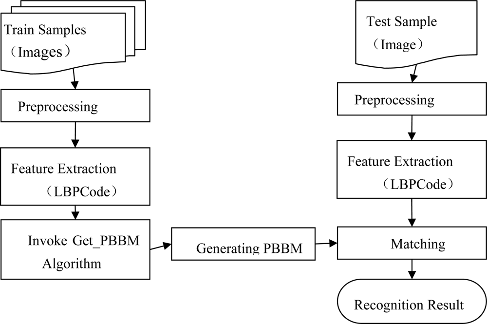 Based on the mentioned algorithms 1 and 2, we propose a finger vein recognition method based on PBBM. It mainly involves two stages: a training stage and a recognition stage. The training stage aims to generate the PBBM for each individual, which includes preprocessing, feature extraction, invoking Get_PBBM algorithm and finally generating the PBBM. In the recognition stage, we first preprocess the test sample, and then extract the LBPCode, and next compute the similarity between the LBPCode and the PBBM of a certain individual, finally obtaining a recognition result with a given threshold. The framework of the proposed method is demonstrated in Figure 3.