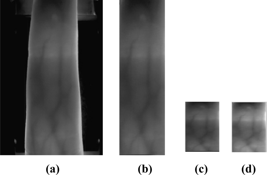 ROI extraction: As the background of finger vein region might include noise, we employ an edge-detection method to segment the finger vein region from the gray-scale image. A Sobel operator with a 3×3 mask is used for detecting the edges of fingers. The width of the finger region can be obtained based on the maximum and minimum abscissa values of the finger profile, and the height of the finger region is similarly detected. A rectangle region can be captured based on the width and height. This rectangle region is called ROI (as shown in Figure 4(b)).