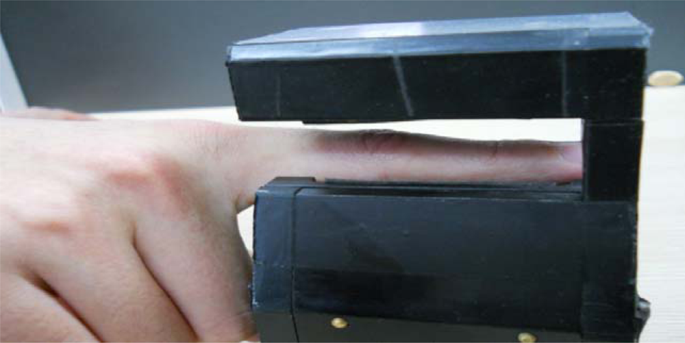 The experiments were conducted using our finger vein database which is collected from 106 individuals (including 86 males and 20 females, Asian race) index fingers of right hand, where each index finger contributes 14 finger vein images. Each individual participated in two sessions, separated by two weeks (14 days). In each session, seven samples were collected from right hand of each individual. The age of the participants was between 19 and 60 years and their occupations included university students, professors, and workers at our school. The capture device was manufactured by the Joint Lab for Intelligent Computing and Intelligent System of Wuhan University, China. The capture device mainly consists of a near-infrared light source, lens, light filter, and image capture equipment. Vein patterns cannot be observed using normal, visible rays of light since they are beneath the skin’s surface. However, vein patterns can be viewed through an image sensor which is sensitive to near-infrared light (wavelengths between 700 and 1,000 nanometers), because near-infrared light passes through human body tissues and is blocked by pigments such as hemoglobin or melanin. To obtain a stable finger-vein pattern, our light source uses a near-infrared light source with wavelength of 890 μm, the image capture part uses a near-infrared CCD camera with a wavelength of 900 μm. A groove in the shell of the device is used to guide the finger orientation, and the capture device is illustrated in Figure 5.