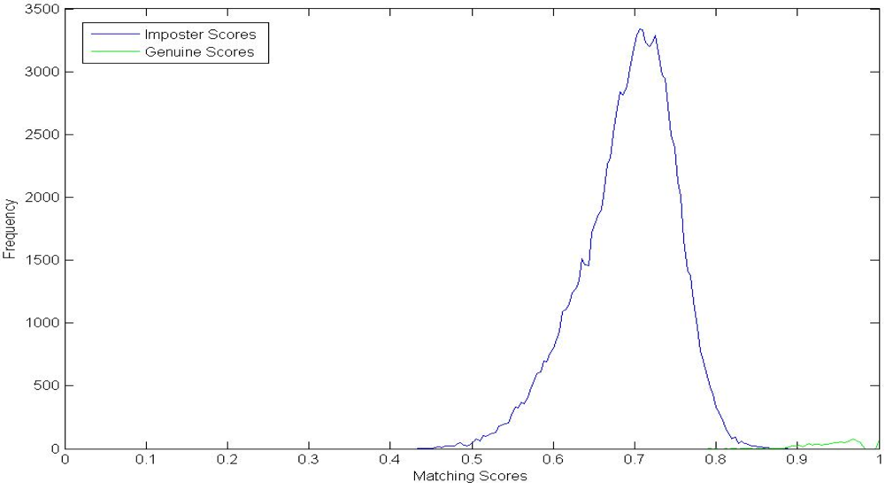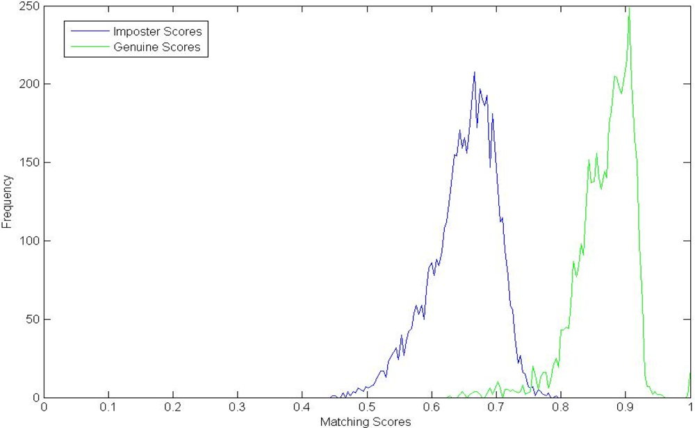 We compare the proposed method with the LBP-based method in [27], Genuine and imposter matching score distributions of these two methods are shown in Figures 7 and 8, respectively. From Figure 7, we can see that the genuine and imposter match scores by LBP are overlapped between 0.6 and 0.8. Otherwise, the genuine matching scores by PBBM are mainly between 0.85 and 1.00, and the imposter matching scores are mainly between 0.55 and 0.80.