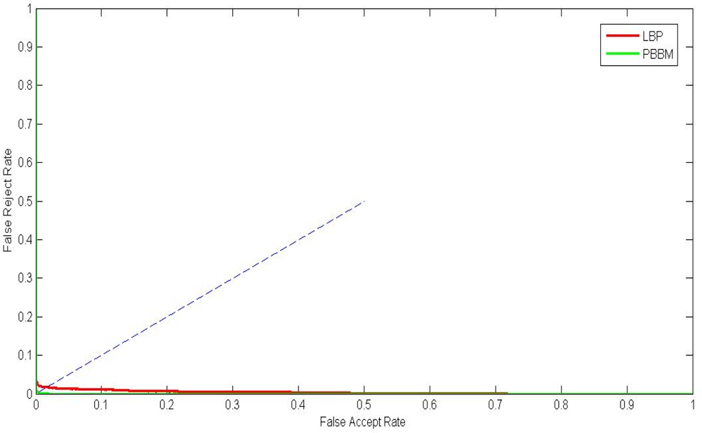 The ROC curves are shown in Figure 9. The ERR, FRR at-zero-FAR and FAR at-zero-FRR values are listed in Table 3. From Figure 9 and Table 3, we can see that the proposed method achieves a much lower EER than the LBP-based method. This indicates that the PBBM is beyond suitable features which truly reflect the characteristics of a certain individual. Besides, it can remove the noisy bits. Because the PBBMs of every individual are different from each other, the PBBM can better illustrate the differences between the individuals.