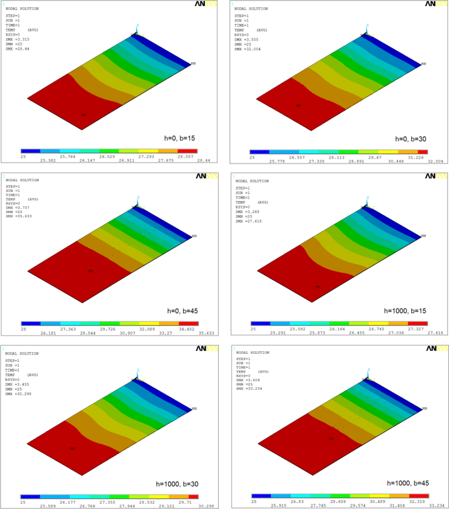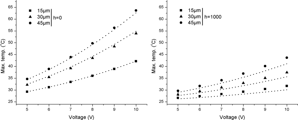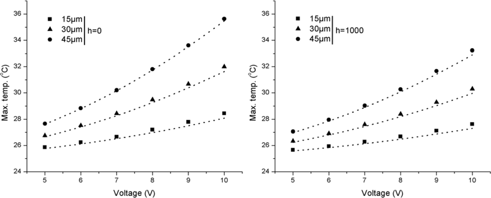 Figure 2 presents the comparison between simulation and analytical results for Si/Si cantilevers operated at h = 0 and h = 1,000 W/m2·°C. The element and the substrate were made of Si. The analytical results were determined from Equations (2) and (4), respectively, for the conduction-only case (i.e., h = 0) and the conduction-convection case (i.e., h = 1,000 W/m2·°C). The element width was 15 μm, 30 μm, and 45 μm, and the applied voltage was increased from 5 to 10 V. It can be seen in the figure that the simulation results match well to the analytical results. The maximum deviation between the two results for h = 0 and h = 1,000 W/m2·°C are 1.28%, 1.16% and 0.45%, and 1.14%, 1.11% and 1.01% for the widths 15 μm, 30 μm and 45 μm respectively. The change in operating medium from h = 0 to h = 1,000 W/m2·°C decreased the maximum temperatures from 28.44, 32.01 and 35.63 °C to 27.62, 30.30 and 33.23 °C for the widths 15 μm, 30 μm and 45 μm, respectively. The reduction in temperatures is understandable because the high value of convective coefficient of heat transfer results in high heat loss from the cantilever.