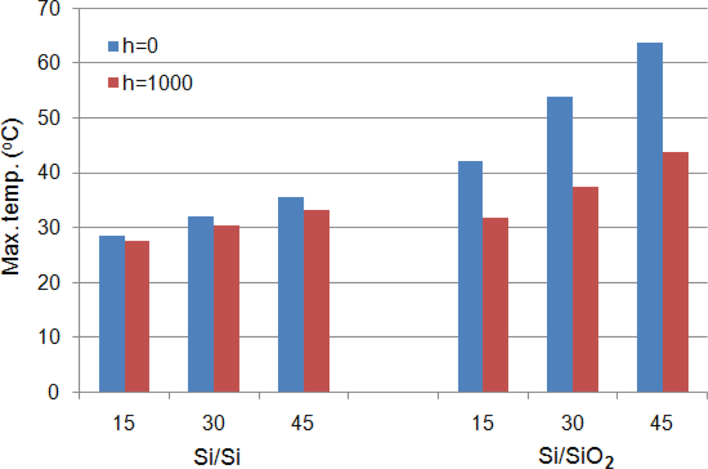 Figure 4 shows the comparison between maximum temperatures observed in Si/Si and Si/SiO2 cantilevers with different element widths for h = 0 and h = 1,000 W/m2·°C operated at 10V. It is obvious in the figure that the change in cantilever substrate material from Si to SiO2 produced higher temperatures. This can be explained by Equation (1), which states the temperature produced is inversely related to the thermal conductivity of the cantilever material. Since the thermal conductivity of Si is more than 100 times SiO2 (Table 1), the temperature increase will be lower in case of Si cantilevers. The change in operating medium from h = 0 to h = 1,000 W/m2·°C results in temperature decrease in both cantilevers. The decrease is, however, more pronounced in Si/SiO2 cantilevers. This can be explained by the relatively higher temperature gradient existing for convective heat loss in Si/SiO2 cantilevers. In other words, high temperatures also produce relatively high temperature decrease during convection heat loss.