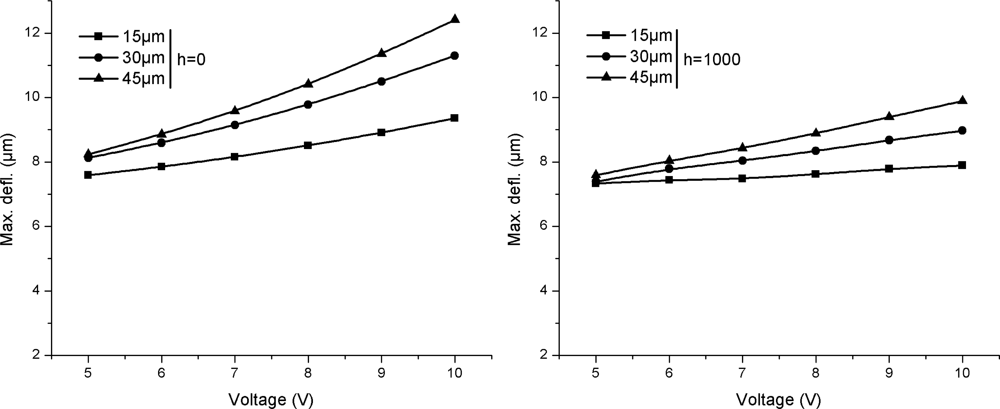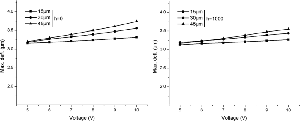Figure 5 presents the maximum deflections produced in Si/Si cantilevers operated at h = 0 to h = 1,000 W/m2·°C. The deflections are produced because of the bimorph bending action in the cantilevers. The maximum deflections for h = 0 are 3.32 μm, 3.56 μm and 3.74 μm, and for h = 1,000 W/m2·°C are 3.27 μm, 3.44 μm and 3.55 μm for the widths 15 μm, 30 μm and 45 μm, respectively. Thus, it can be seen that the change to high h medium decreased the deflections in the cantilevers. The decrease can be attributed to the lowering in maximum temperature observed in the same cantilevers when operated in the same environment (Figure 2). The relative decrease in maximum deflections is similar to the relative decrease in maximum temperatures shown in Figure 2. Therefore, the temperatures and the deflections are closely related.
