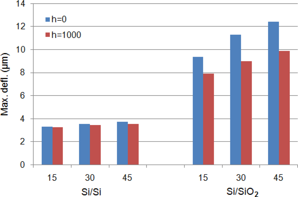 Figure 6 shows the maximum deflections produced in Si/SiO2 cantilevers operated at h = 0 to h = 1,000 W/m2·°C. The maximum deflections for h = 0 are 9.36 μm, 11.30 μm and 12.41 μm, and for h = 1,000 W/m2·°C are 7.89 μm, 8.97 μm and 9.89 μm for the widths 15 μm, 30 μm and 45 μm, respectively. It is obvious in the figure that the change in cantilever substrate material from Si to SiO2 not only produced higher temperatures but also higher deflections. In fact, the deflection values observed in Si/SiO2 cantilevers are more than two times the Si/Si cantilevers. The increase in deflections can be attributed to the combined effect of higher temperatures and lower bending stiffness of Si/SiO2 cantilevers. The high temperatures in Si/SiO2 cantilever produce larger bimorph bending. In addition, the low elastic modulus of SiO2 reduces the bending stiffness of Si/SiO2 cantilevers. Therefore, high temperatures combined with low bending stiffness ultimately result in higher deflection in Si/SiO2 cantilevers. It can also be seen in Figure 6 that the relative decrease in deflections because of change in operating medium is more significant in case of Si/SiO2 cantilevers than in Si/Si cantilevers. This observation can be attributed to the relative larger temperature drop in Si/SiO2 cantilevers when operated in h = 1,000 W/m2·°C (Figure 3).