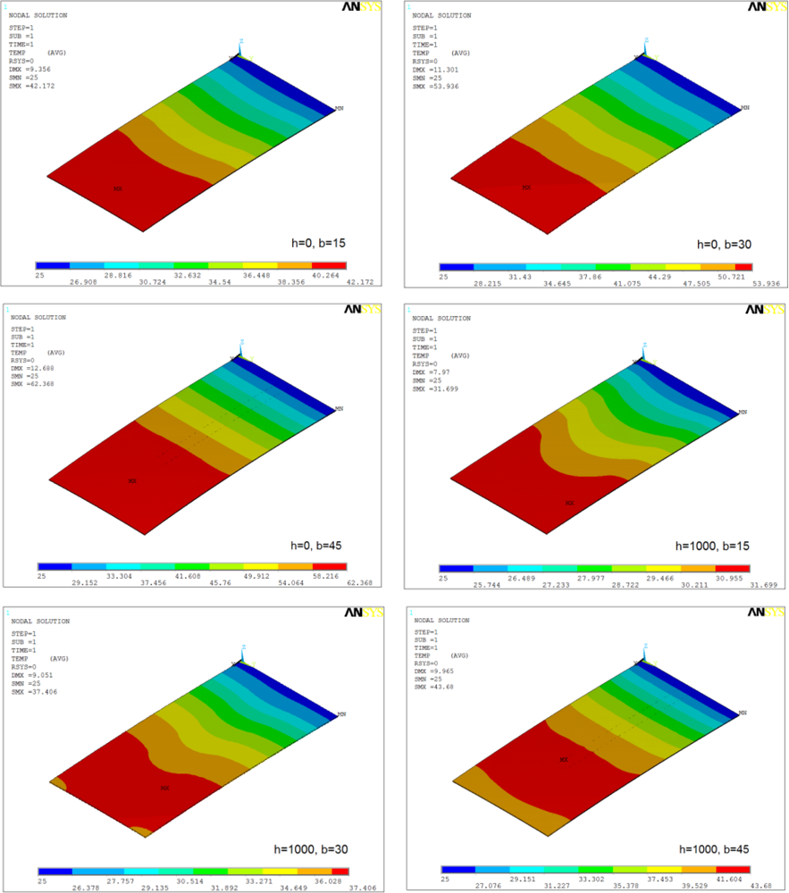 The comparisons between simulation and analytical results for Si/SiO2 cantilevers operated at h = 0 and h = 1,000 W/m2·°C are shown in Figure 3. In this case, the element material was Si but the substrate was SiO2. The results were determined from Equations (2) and (4), as before. The simulation results show good accord with the analytical results. The maximum absolute deviation between the two results for h = 0 and h = 1,000 W/m2·°C are 0.09%, 1.76% and 1.52%, and 5.02%, 4.76% and 5.88%, respectively for the three widths. The deviation values observed in case of Si/SiO2 cantilevers are higher than Si/Si especially in case of h = 1,000 W/m2·°C. It can also be observed in Figure 3 that the temperature decrease caused by the change in operating medium is more influential in case of Si/SiO2 cantilevers. The change from h = 0 to h = 1,000 W/m2·°C decreased the maximum temperatures from 42.17, 53.94 and 63.66 °C to 31.70, 37.41 and 43.68 °C for the widths 15 μm, 30 μm and 45 μm, respectively.