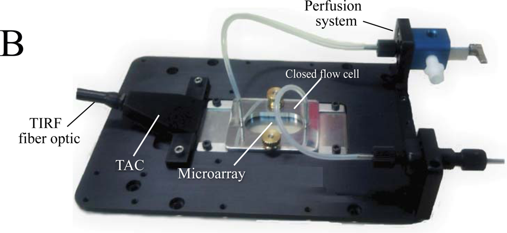 The LG-TIRF-MB system was designed by TIRF Technologies Technologies, Inc. in collaboration with Angélica Zepeda and Luis Vaca. The system was mounted on top of an inverted Nikon microscope equipped with a 2× objective. Excitation wavelength was 532 nm using a 150 mW laser and emission intensity was collected at 554 nm. An iXon electron multiplied cooled (EM-CCD) camera (Andor Technology) was utilized for image acquisition. The camera was cooled down to −80 °C prior to beginning acquisition. Time-based acquisitions were obtained with time intervals of 1 second and integration time of 0.5 seconds. Typical experiments were carried out for 12–15 minutes and contained hundreds of microarray images.