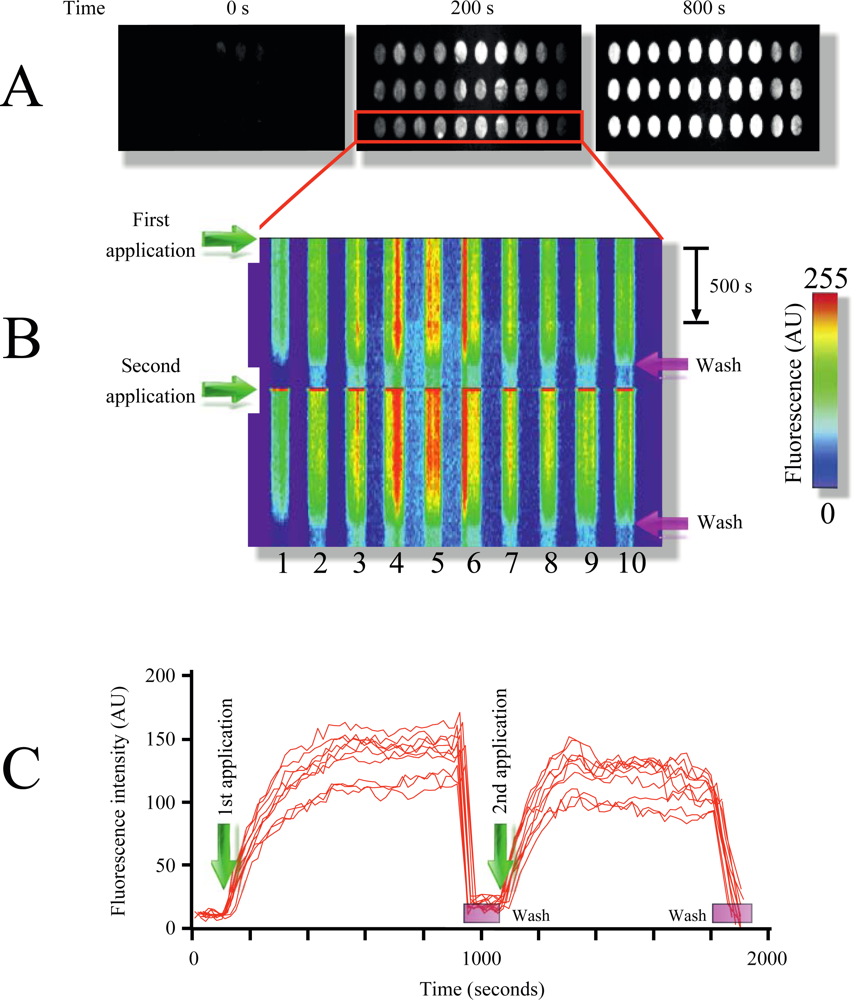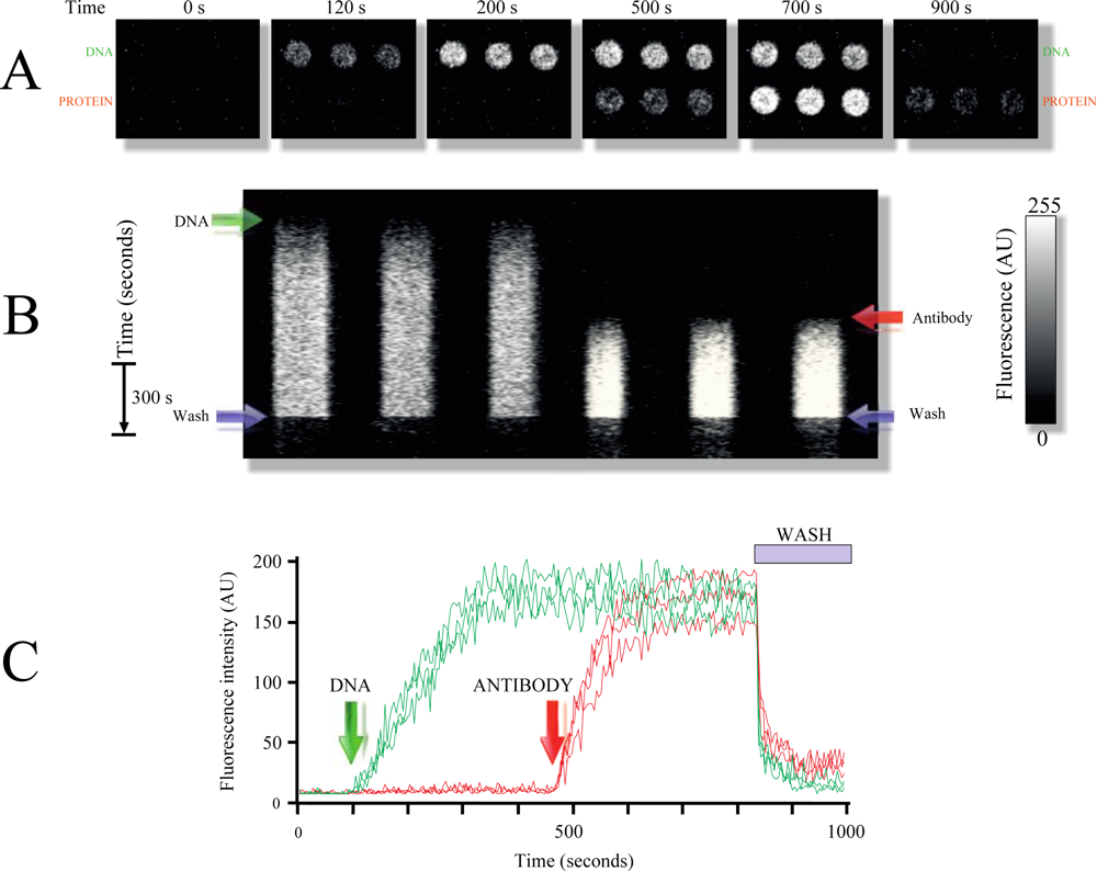 As illustrated in Figure 3(C), the combined DNA-protein TIRF microarray can be regenerated also using the same rinsing solution (Experimental Section). Using multiple replicate spots of the same probes demonstrates the robustness and reproducibility of the response in the TIRF microarray platform (Figure (3) and supplemental video 2).