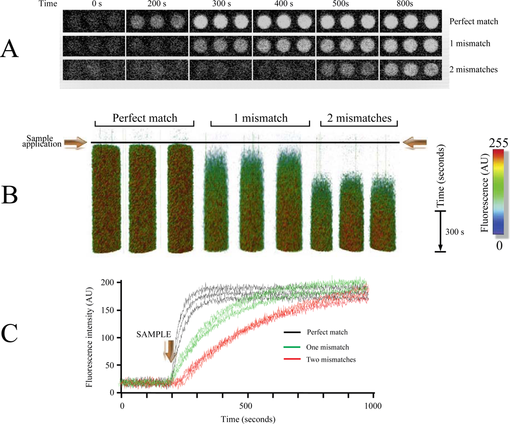 As illustrated in Figure 4(C), using LG-TIRF-MB technology was relatively simple to identify single and multiple mismatches by comparing target-MB association kinetics. This simple experiment demonstrates the flexibility and usefulness of measuring kinetics in microarrays.