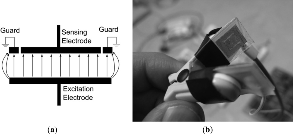 The capacitance sensor [14] is essentially two plates of a parallel plate capacitor with so that when it is placed over an extremity, the tissue of the extremity forms the capacitor dielectric. A grounded guard rail was added as shown in Figure 1(a) which has the effect of reducing sideways ‘leakage’ of electric field at the edge of the sensor, i.e., the field lines are effectively straightened at the plate edges. The plates were electrically insulated from the tissue using 0.1 mm thick adhesive cellulose film. The plates were attached to two limbs of a pulse oximeter probe shell as shown in the photograph in Figure 1(b). One plate (the excitation electrode) is attached to a signal generator supplying a 100 kHz sinusoidal signal of 1.5 V rms amplitude.