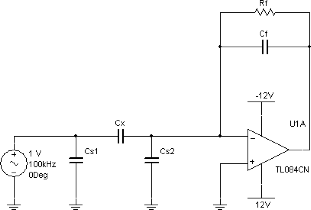 Cx is the capacitive sensor and Cf is the feedback capacitance. Rf is needed to bias the op-amp—to prevent the op-amp output drift which would eventually saturate the op-amp. The output of the circuit, Vout, is given by: