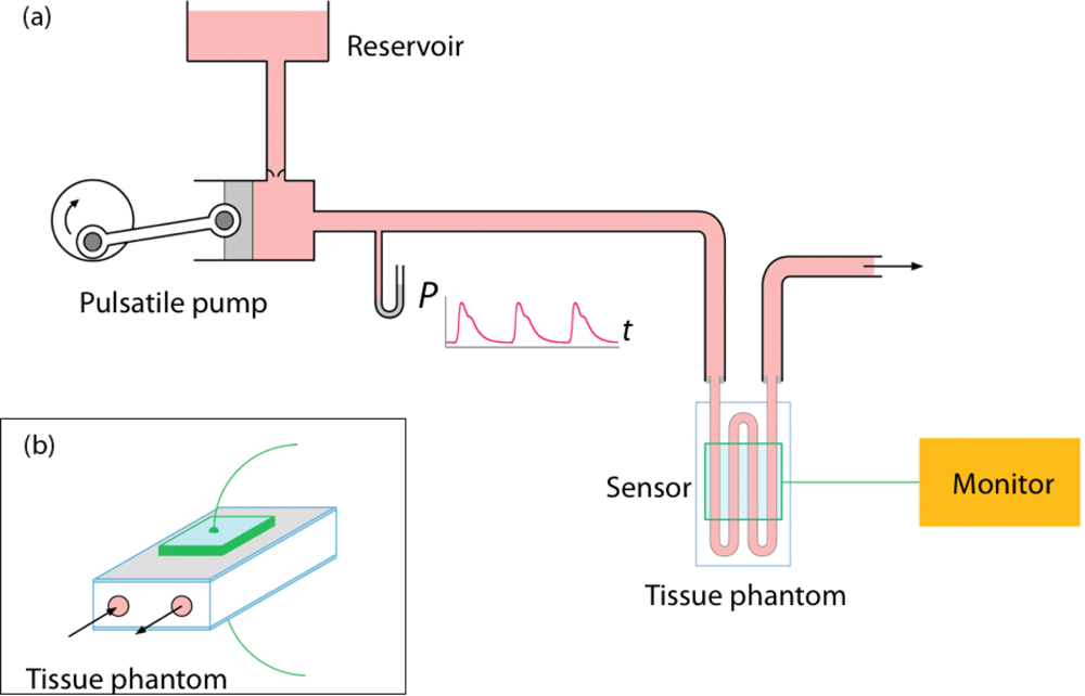 A simple model of the circulation was constructed for the purposes of evaluating the performance of the electrical and optical sensors, which is shown schematically in Figure 3. A mixture of 0.9% saline containing black pigment dye was pumped using a custom pulsatile pump capable of generating a physiologic arterial pressure waveform of varying pulse pressure (systolic pressure minus diastolic pressure: selectable from 20 to 220 mmHg), at a constant frequency of 1 Hz (60 bpm ‘heart rate’). The pump was connected using a short length of stiff arterial pressure catheter tubing to a custom tissue phantom. The phantom consisted of a loop elastic silicone tubing of internal diameter 2.2 m enclosed within a glass cuvette of dimensions (h × d × w) 35 × 10 × 10 mm. The phantom is thus incompressible, being enclosed in glass. Besides the silicone tubing, the cuvette was otherwise empty, containing only air.