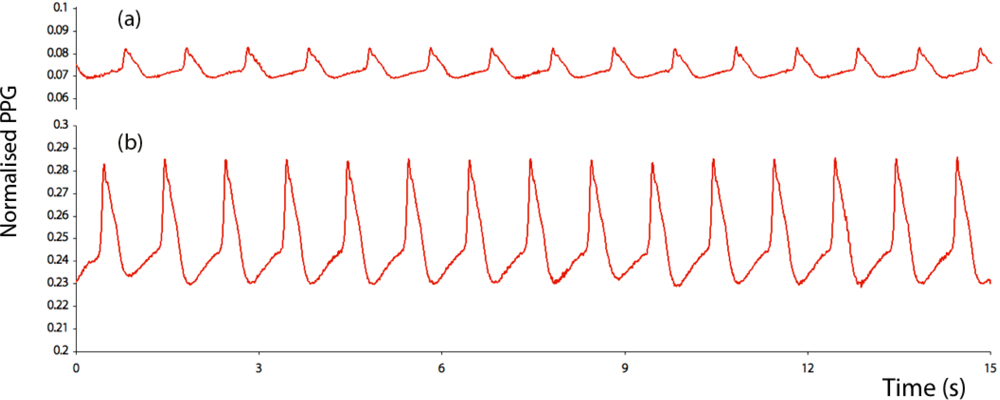 The optical sensor was fabricated using a commercial earlobe pulse oximeter (GE Healthcare, Helsinki, Finland). The red-emitting light-emitting diode and PIN photodiode were utilized to make a single wavelength photoplethysmograph sensor. The LED was driven by a 24 mA dc signal, while the photodiode was connected to a transimpedance (I-V) amplifier of gain 6.67 × 105 VA−1 and the signal lowpass filtered to produce a dc output. The signal was also bandpass filtered (0.4 Hz–15.9 Hz), and amplified to produce an ac output signal. The normalized (ac/dc) absorbance was calculated thus