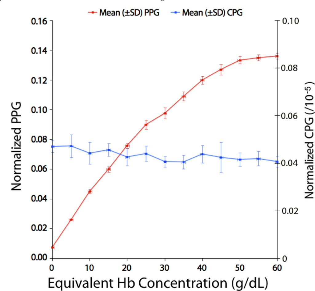 Figure 6 shows a graph of the peak-to-peak amplitudes of the normalized optical and capacitance signals (PPG and CPG respectively) plotted against equivalent hemoglobin concentration.