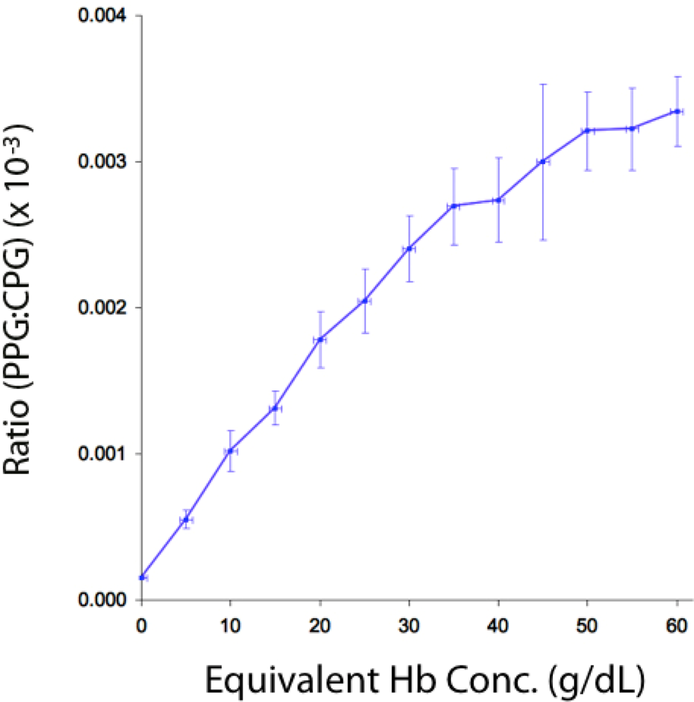 It can be seen that the mean PPG amplitude increases greatly with increasing dye concentration. By contrast, the CPG amplitude changes little, decreasing very slightly, with increasing dye concentration. Figure 7 shows a graph of the ratio PPG:CPG amplitude (mean ± SD) against equivalent hemoglobin concentration. It can be seen that this ratio increases with increasing concentration.