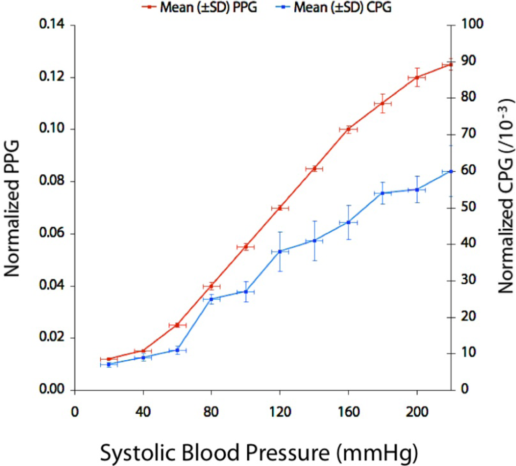 The following results were obtained from the second part of the study: an investigation of the effects of pulse pressure. Figure 8 shows a graph of the peak-to-peak amplitudes of the normalized optical and capacitance signals (PPG and CPG respectively) plotted against systolic pressure. Both quantities on the graph increase with increasing systolic blood pressure.