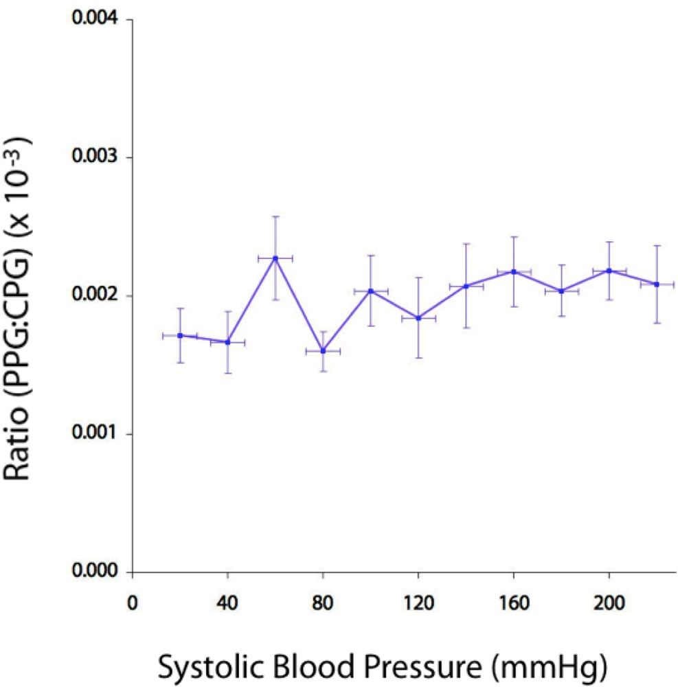 Figure 9 shows a graph of the ratio PPG:CPG amplitude (mean ± SD) against pulse pressure. It can be seen that this ratio is not affected greatly by changes in pulse pressure. It can also be seen that the ratio varies considerably at low (<80 mmHg) pressures. This is thought to be due to low values of both PPG and CPG amplitude, resulting in relatively large variation in these quantities.