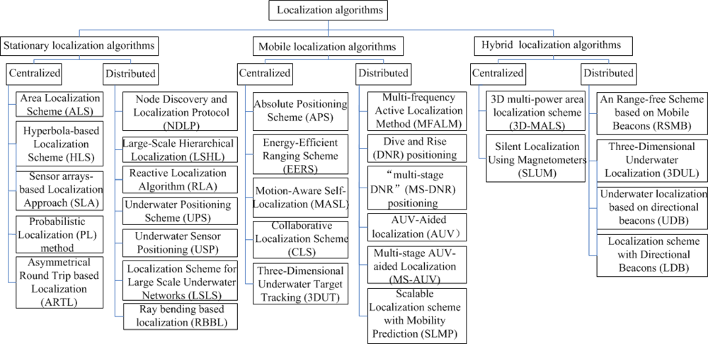 As shown in Figure 1, localization algorithms are classified into three categories. (1) In stationary localization algorithms, all sensor nodes are static. They are attached to surface buoys or ocean floor units which have fixed locations. (2) In mobile localization algorithms, all sensor nodes are mobile. They freely drift with water currents or use propelled equipments, e.g., Autonomous Underwater Vehicle (AUV), to control their movements. (3) In hybrid localization algorithms, stationary and mobile sensor nodes coexist. These three categories are further divided into subcategories of centralized and distributed localization schemes.