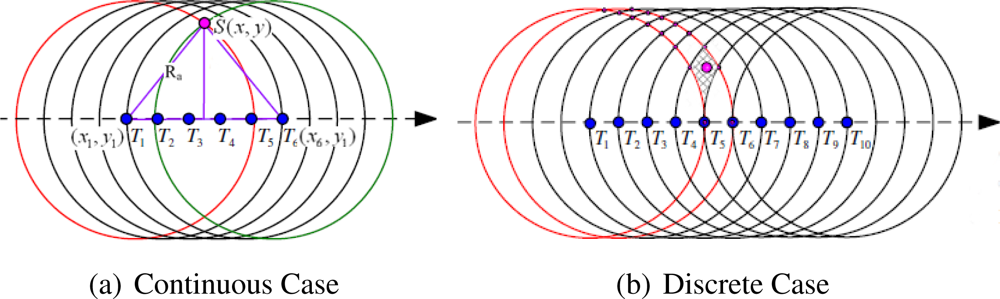 In wireless communication process, in order to avoid excessive collisions occurring over a shared channel, the gathering of ranging information actually occurs over a short time epoch T. The problem is that mobility causes the node positions to change significantly during epoch T. Therefore, in [], the authors proposed a Motion-Aware Self-Localization (MASL) scheme for mobile UWSNs. During MASL, nodes first perform ranging with their neighbors to get all the distance estimates in the localization epoch. Then, all distance estimates are sent to a central station and processed offline. An iteration algorithm is started to obtain the positions. At each iteration, the algorithm refines position distributions by dividing the area of operation into smaller grids, selecting the area in which the node resides with high probability and using it in the next iteration.