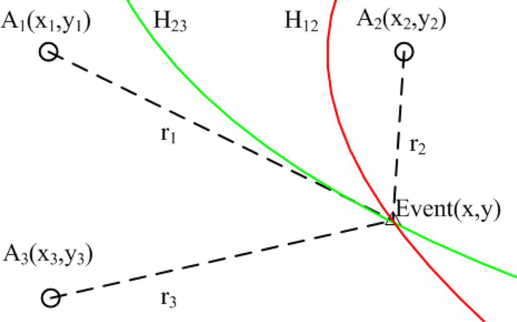 In [], the authors proposed a Hyperbola-based Localization Scheme (HLS). Instead of using the commonly adopted circle-based detection and least squares algorithm based location estimation, the proposed scheme utilizes the hyperbola-based approach for localization and a normal distribution for estimation error modelling and calibration. As shown in Figure 2, when any unknown node detect one event, it will report the event to anchor nodes immediately. Anchor nodes A1 and A2 receive the event at time t1 and t2. The difference between t1 and t2 is a constant, in other words, the difference between the corresponding distance r1 and r2 is a constant. Based on the property of hyperbola, the unknown node is localized on a hyperbola N12. Similarly, another hyperbola N23 is plotted in the same figure. More curves can be added when more anchor nodes are involved in localization. The intersection of any two curves gives an estimation position of unknown node. In practical applications, the obtained set of intersection points may not coincide or converge well. In this case, algorithms like least squares can be adopted to further improve localization accuracy.