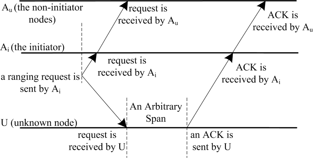 An Asymmetrical Round Trip based Localization (ARTL) algorithm is proposed in []. ARTL assumes that anchor nodes can receive their own packets while unknown nodes cannot do. First, the basic ranging scheme is implemented to get distances between anchor nodes and unknown nodes. As shown in Figure 3, unlike existing symmetrical round-trip schemes [,], the ranging scheme here is asymmetric; that is, to estimate the distance between an anchor node and unknown node U, the initiator (the anchor node that starts the ranging task) Ai first broadcasts a ranging packet, which is received by both itself and U, as well as other non-initiator nodes Au. Then after an arbitrary period, U responds an ACK to Ai. This ACK will not be received by U itself, but only received by Ai as well as Au. Based on the time difference of arrival signals, the distance can be calculated. Together with collect data information, the calculated distances are sent to the base station which launches localization task. Thus, no time synchronization is required in the entire process and no complex computations are handled by anchor nodes and unknown nodes. Moreover, ARTL does not require unknown nodes to immediately reply after receiving the ranging broadcast, so U can respond ACK whenever it is convenient.