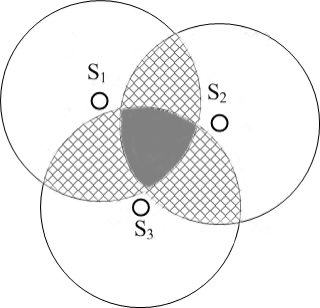 In [,], the authors proposed a Node Discovery and Localization Protocol (NDLP) to manage sub-sea localization. As shown in Figure 4, NDLP starts with one seed node (primary seed S1) with known position. The primary seed node is capable of determining the relative positions of neighboring nodes. A second seed node, S2 is then chosen by S1. S2 is the most distant node within the communication range of S1. The advantage of choosing the farthest node as the second seed node is that a larger area can be covered more quickly. A third seed node S3 is chosen from those nodes that lie in both communication ranges of S1 and S2, and has the maximum summation distance from S1 and S2. Each node in the overlapping region (the grey area in Figure 4) is able to calculate the relative location using a simple triangulation technique. The nodes in the cross-hatched region in Figure 4 can only obtain two distance measures from seed nodes. In order to localize the nodes in the cross-hatched region, a fourth seed node is selected based on four algorithms, Farthest/Farthest Algorithm, Farthest/Nearest Algorithm, Nearest/Farthest Algorithm and Nearest/Nearest Algorithm.