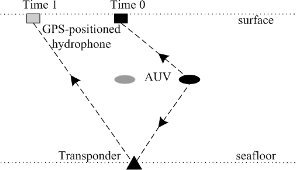 Autonomous Underwater Vehicles (AUVs) provide researchers with new forms of access to ocean. Exploiting AUVs requires AUVs’ accurate position information. Thus, in [], an Absolute Positioning Scheme (APS) is proposed to localize an AUV. As shown in Figure 7, an AUV transmits an interrogation pulse at a fixed rate. The signals received at the surface consist of a direct signal from the AUV and a reply from each of the transponders. The time difference of arrivals along with depth measurements from an onboard pressure sensor are used to localize the AUV.