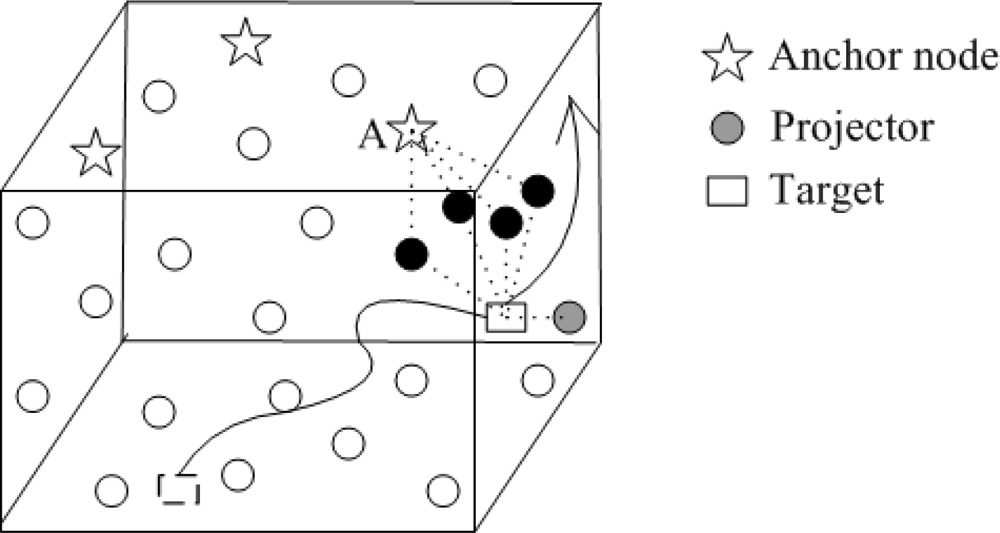 A Three-Dimensional Underwater Target Tracking (3DUT) scheme is proposed in []. As shown in Figure 9, at least three anchor nodes float at the surface of water. One of these nodes is the sink (node A) which collects the information from underwater sensor nodes and carries out the calculations. The black nodes collect and send information from the target to the sink. The gray node is the designated projector node. 3DUT is a two phase algorithm. During the first phase, Passive Listening, sensor nodes listen to the underwater environment for potential targets. The second phase of the algorithm, Active Ranging, is to localize the target. 3DUT selects a projector node which sends pings periodically. The target is assumed to be a point target so that the echoes are radiated isotropically. Once the echo is received by the projector, it calculates its distance to the target and transmits to the sink node. Sink node uses trilateration to localize the target. The location and the calculated velocity of the target are then exploited to achieve tracking. Depending on the results of the calculations, sink node selects a new projector node.